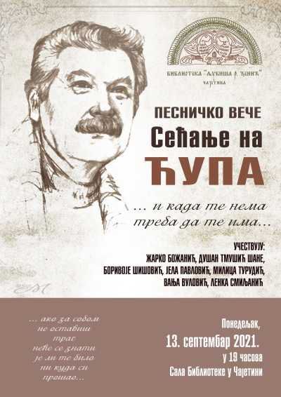 "Ове године "Сећање на Ћупа" замишљено је као колажни програм, који ће се реализовати 13. септембра 2021. године у 19 часова у сали библиотеке Љубиша Р. Ђенић у Чајетини. Уз помоћ више учесника, колико нам