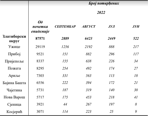 Од претходног извештаја до данас COVID-19 је потврђен код 37 лица: Ужице – 15, Ариље – 6, Нова Варош – 4, Пожега – 4, Чајетина – 4, Прибој – 2 и Пријепоље – 2. Од почетка епидемије до данас укупно је потврђено 87571 случајева инфекције корона вирусом (COVID-19) на територији Златиборског округа.