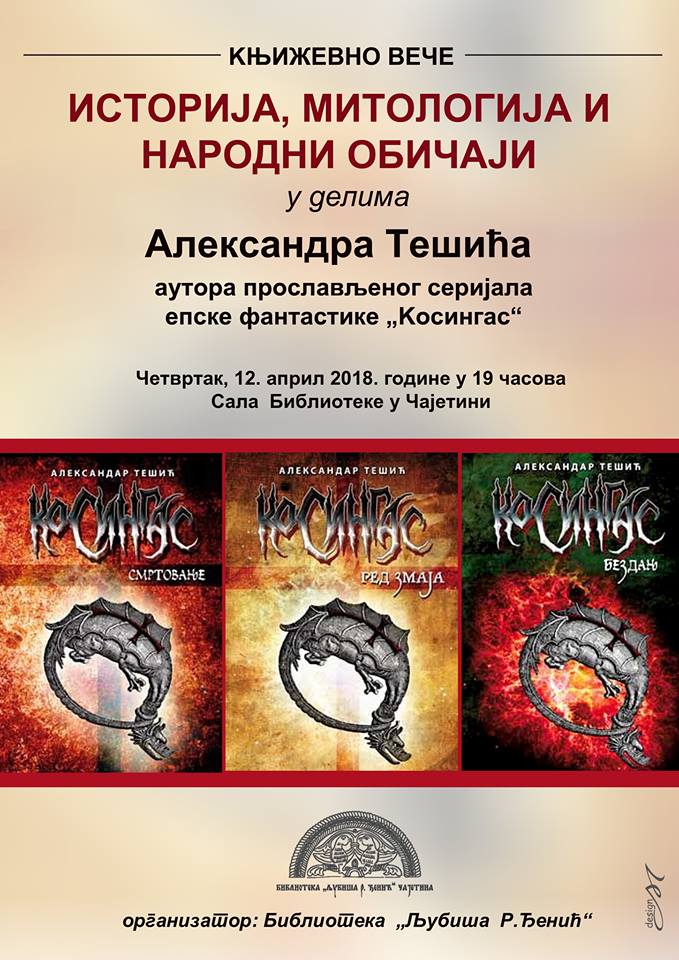 У библиотеци "Љубиша Р. Ђенић" ће 12.04.2018. у 19.00 бити уприличено дружење са писцем Александром Тешићем. Публика ће ове вечери моћи да се, уколико није имала прилику да прочита триологију "Косингас", упозна са идејом настанка ових романа. Историја, митологија и народни обичаји у делима Александра Тешића, тема су о којој ће бити говора.