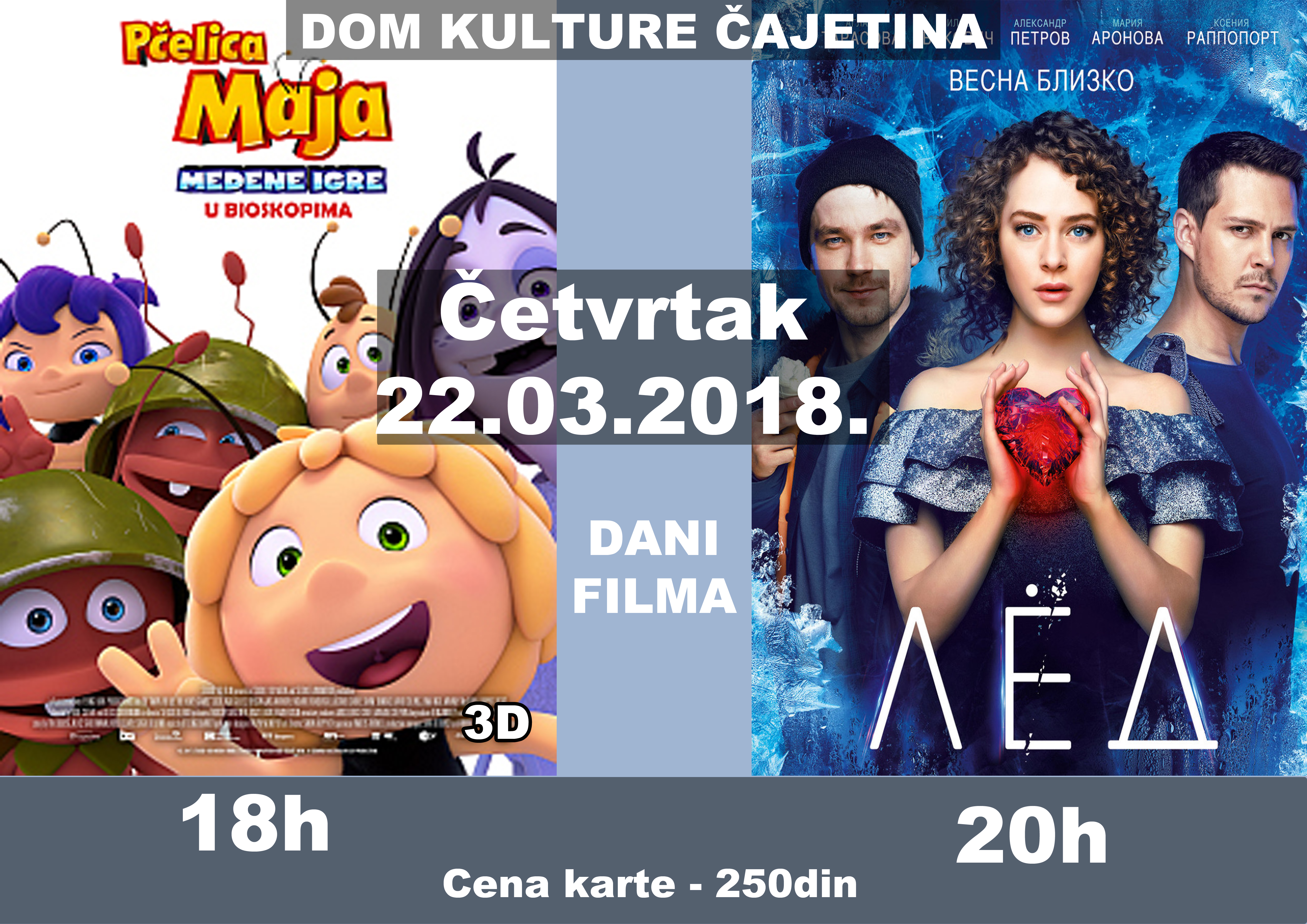 У четвртак у Дому културе у Чајетини одржаће се филмски дан а приказују се филмови Пчелица Маја у 18 и Лед у 20 часова. Цена карте је 250 динара по филму.