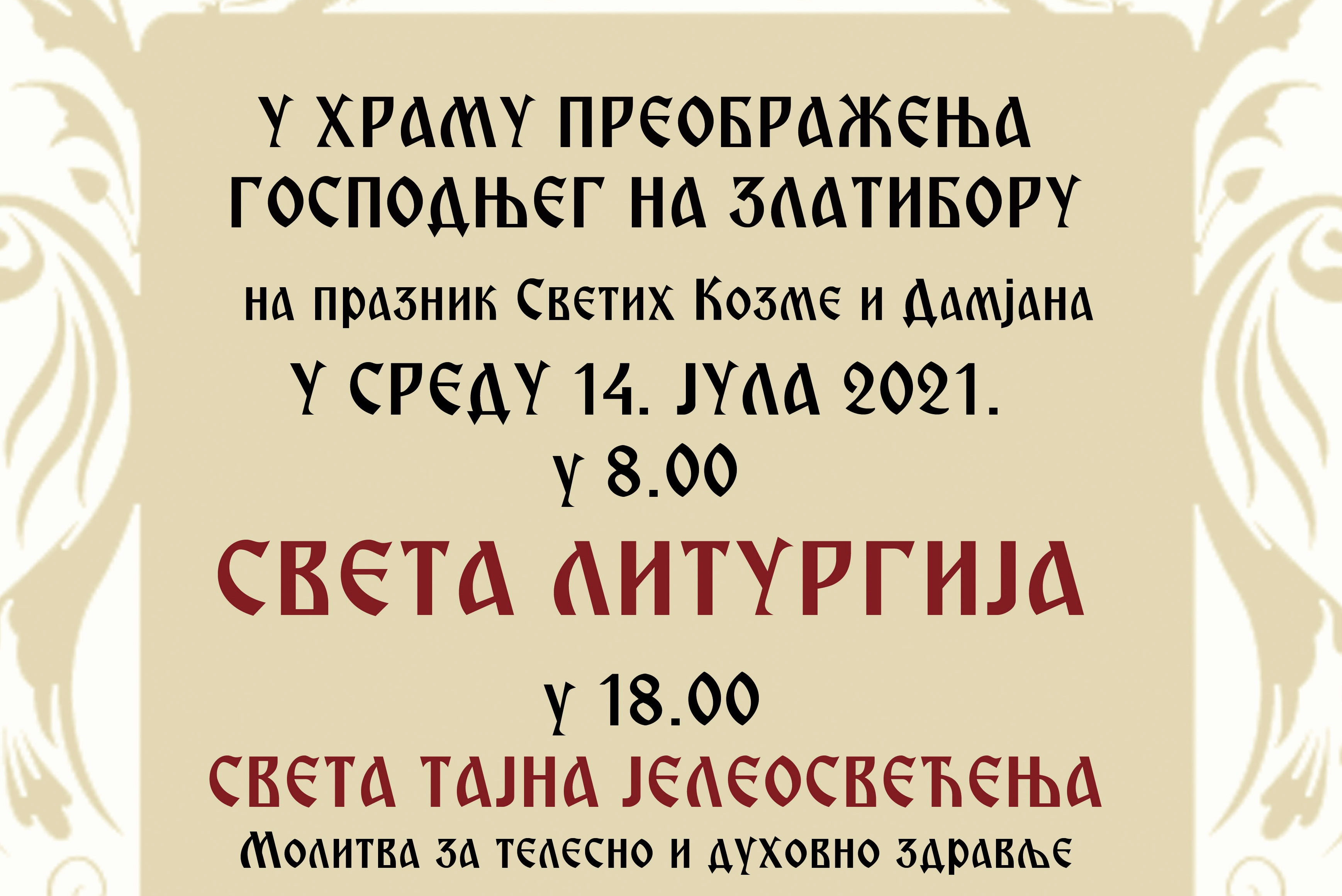 У Храму Преображења Господњег на Златибору у среду 14. јула у 8 часова биће служена Света литургија а од 18 часова Света тајна јелеосвећења.