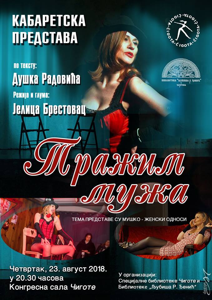 ! ДЕШАВАЊА ! Култура 20 Aug, 2018 „Тражим мужа“ „Тражим мужа“ je кабаретска представа у извођењу Јелице Брестовац,по тексту Душка Радовића која ће се у четвртак, 23.08. у 20.30 одржати у Конгресној сали Чиготе у организацији Специјалне библиотеке Чигота и Библиотеке „Љубиша Р. Ђенић“ из Чајетине. Аутор: Уредник Zlatibor press